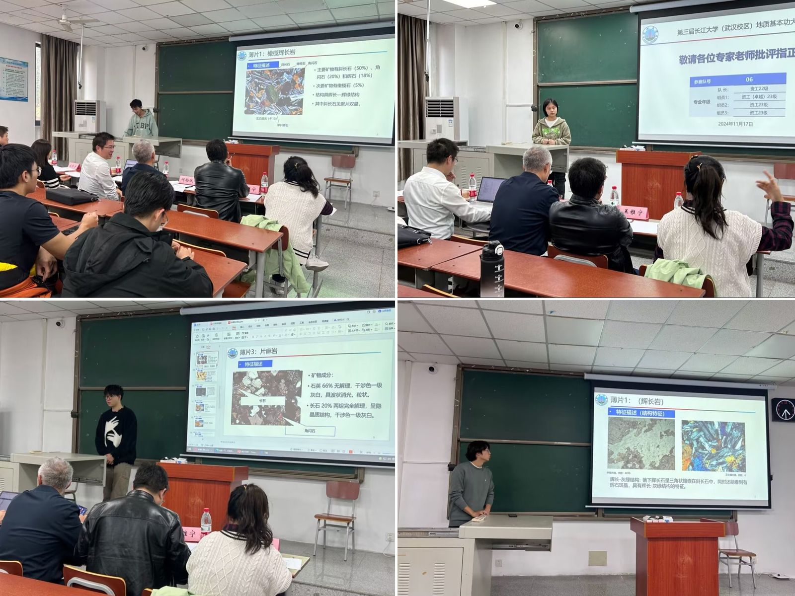 决赛汇报环节,万象城官网何幼斌、高达、王雅宁、李艳青、高洁、宋振宇六位老师担任评委,学工办郭霖老师全程参与。11个决赛队伍代表依次上台汇报,在规定的10分钟时间内,从特征描述和形成原因两个方面,细致讲述每块岩石或化石标本的特点与名称。汇报过程中,同学们条理清晰、声音洪亮、PPT制作精美,充分展示了大家扎实的基本功与专业素养。每队汇报结束后,评委老师进行5分钟的提问与点评。“大理岩中的矿物有哪些?”“什么是辉长结构?”“什么是包裹体?”“菊石的主要生存年代是什么时期?”这些问题不仅考验了选手们的专业知识,也让全场学生进一步巩固专业知识,提升专业学习兴趣和效果。