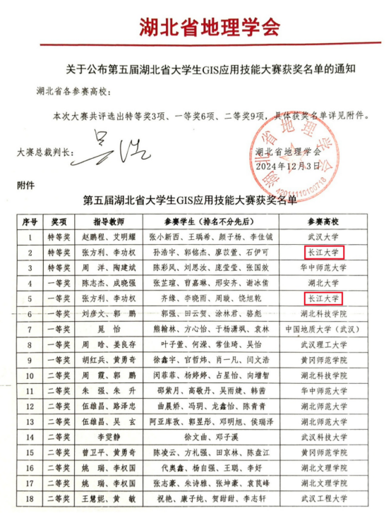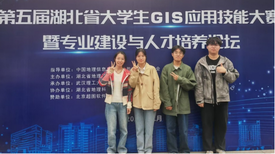 (通讯员:孙浩宇 饶旭乾)2024年11月9日,由湖北省地理学会主办、武汉理工大学资源与环境工程学院和华中师范大学城市与环境科学学院承办的第五届湖北省大学生GIS应用技能大赛于武汉理工大学成功举办。11月22日至24日,由中国地理学会、中国地理信息产业协会主办“第十三届全国大学生GIS应用技能大赛”在兰州交通大学成功举办。万象城官网李功权、张方利两位老师指导的2022级地理信息科学专业学生团队代表万象城awc官网登录入口参与了本届赛事,齐缘、李晓雨、周璇、饶旭乾团队先后获得省赛一等奖和国赛一等奖,孙浩宇、郭铭杰、廖苡萱、石伊可团队获得省赛特等奖。