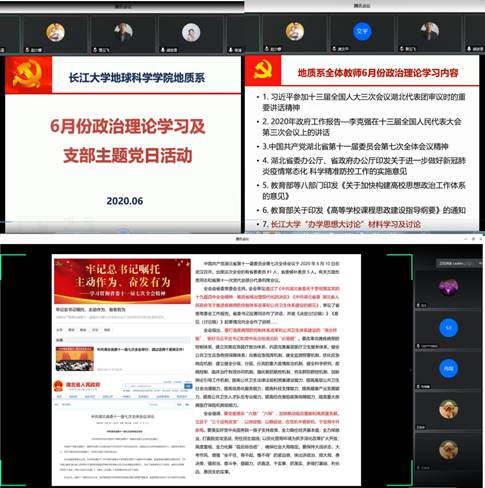 2020年6月18日下午,万象城awc官网登录入口地质系全体教师通过腾讯会议形式开展集中政治理论学习、支部主题党日活动以及地质系教研活动。