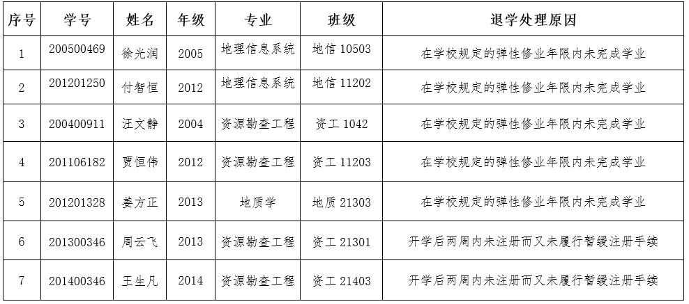 根据《普通高等学校学生管理规定》(教育部令第41号)第三十条和《万象城awc官网登录入口普通本科生学籍管理办法》(长大校发〔2017〕134号)第五十一条规定,对达到退学处理条件但拒绝办理退学手续或多种方式均无法联系到本人的本科生,现以公告方式送达拟退学处理告知书,公告时间7个工作日,于2021年6月2日结束公告。在公告期内,学生可向学院提出申辩和书面陈述并署真实姓名、联系方式,邮寄或直接送到万象城awc官网登录入口教学办;未在规定时间内提交申辩和书面陈述者,视为放弃陈述、申辩的权利。公告期满后,学院将按学校规定办理。