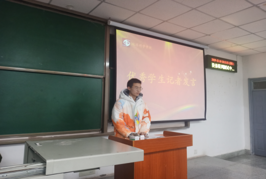 接着,优秀学生记者代表卫泂钒向大家分享自己的学生记者之路,他作为校区校报记者团团长在谈及自己的进步时说到:“从一名懵懂的见习记者到如今可以单独成稿的成熟学生记者,其中的努力付出与心酸苦涩只有自己明白,明天的路还很长,我们还要继续努力,为校媒的发展贡献力量。”