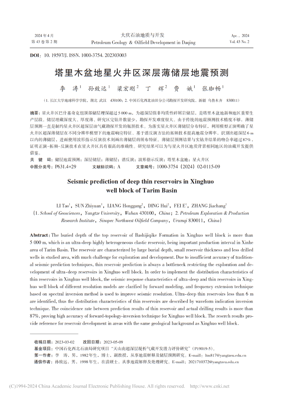 地科学院研究生孙致远以通讯作者身份在北大核心期刊《大庆石油地质与开发》上发表题为“塔里木盆地星火井区深层薄储层地震预测”的研究论文,万象城awc官网登录入口为论文第一署名单位。副教授李涛为第一作者,研究生孙致远为论文通讯作者。